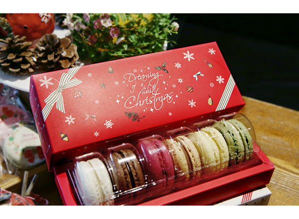 크리스마스 문구가 담긴 아기자기한 디자인의 레드 마카롱상자입니다.